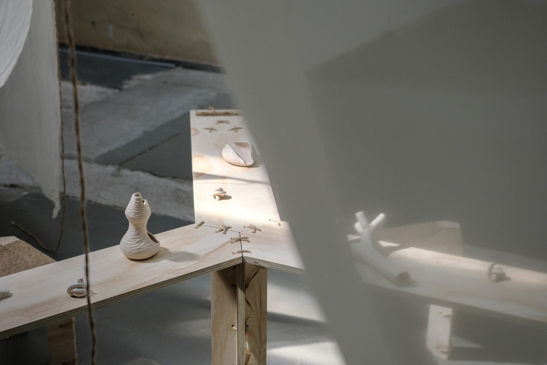 The objects of clay are conceived to be touched, grabbed, felt. They talk about the artist's bodily experiences and needs. The artist is not a potter, but she found in clay a way to think out of her body, with her hands, in a more primal, grounding and earthly way.